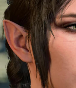 quina's eyes are small and pointed, as in half human half elf style. on her left ear, she sports a simple chain piercing.