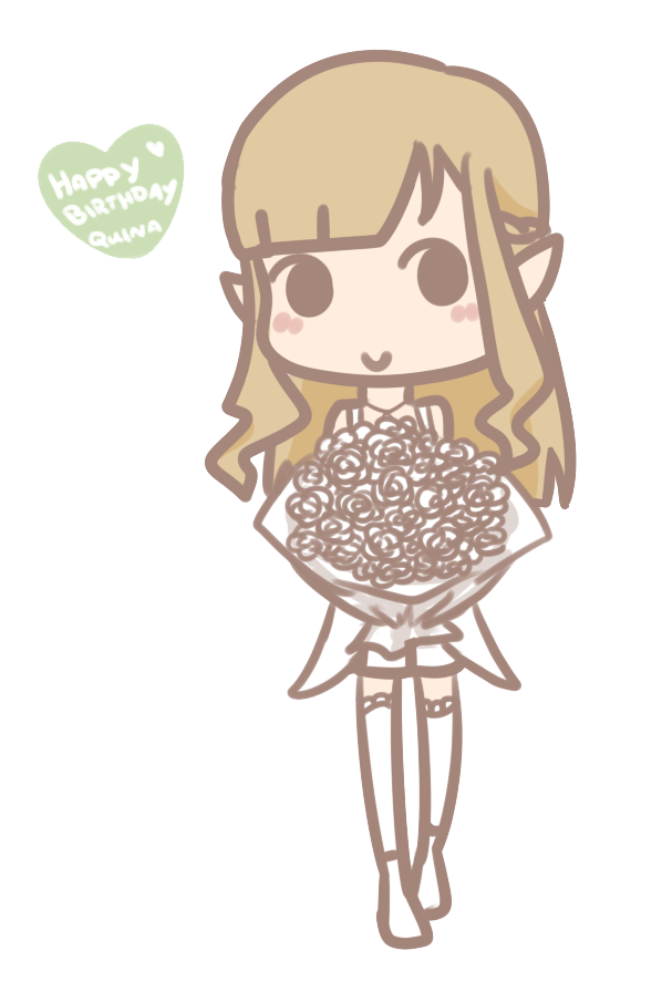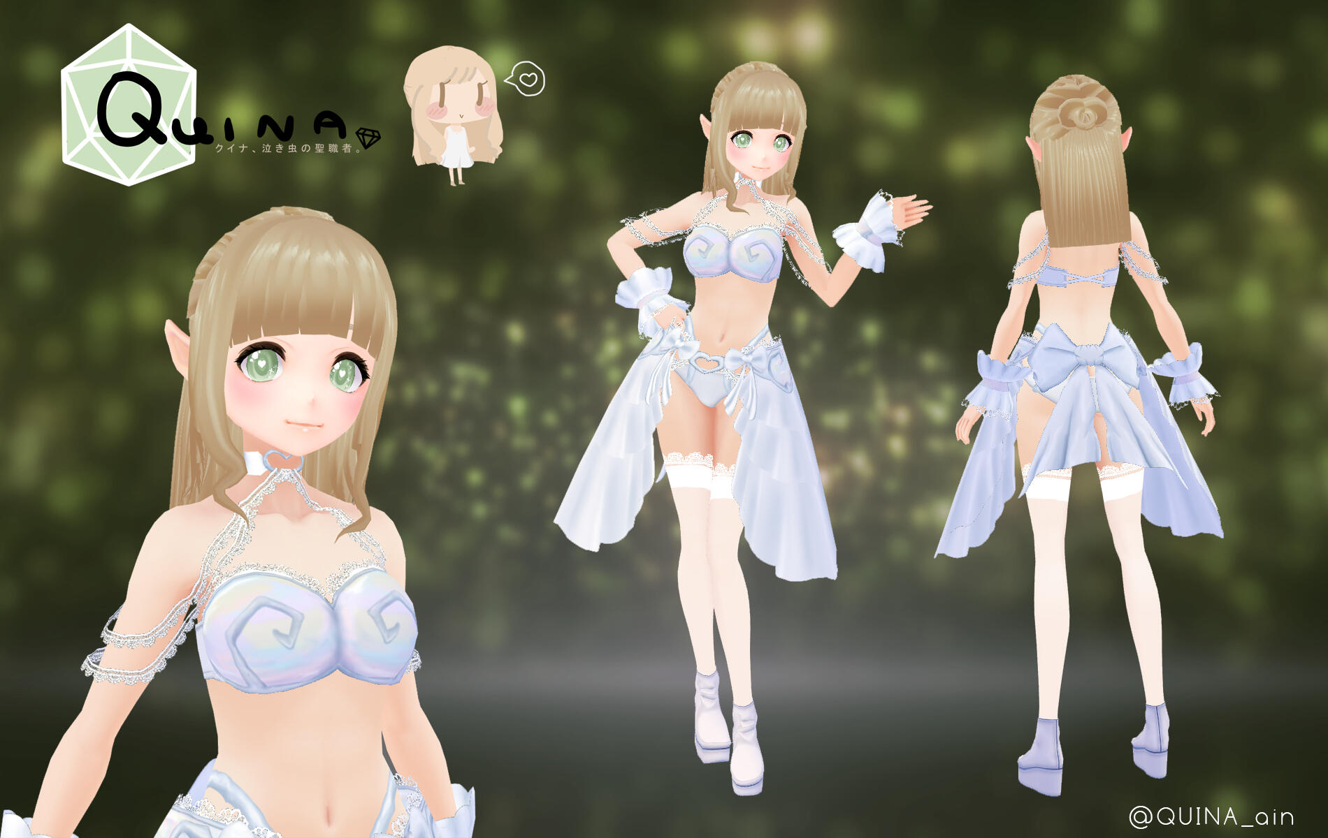 this reference of quina is the most accurate depiction of her. her hair is commonly depicted as golden honey brown, her eyes innocent & wide and shades of soft green. her common colours worn are white and beige/brown. She wears a black heart-collar necklace and dangling piercings from her left ear.